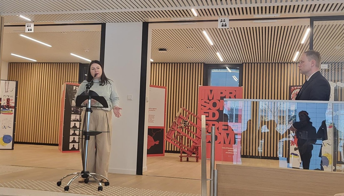 На відкритті медіаекспертка ІМІ Ірина Земляна розповіла про вбитих росіянами медійників Олександра Махова, який став на захист України, і фотожурналіста Максима Левіна і закликала робити все можливе для визволення медійників з російського полону.