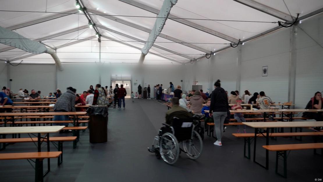 Їдальня в центрі для біженців на території колишнього аеропорту “Тегель”За даними чиновників, нині в “Тегелі” проживають близько 1,5 тисячі українців, тоді як ще рік тому їх було близько п’яти тисяч. Переселення триває з літа: людей переводять до менших притулків у різних районах столиці, зокрема на територію колишнього аеропорту “Темпельгоф”.