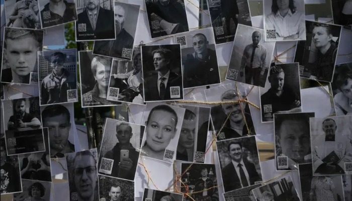 Фото білоруських політв’язнів, які показали під час акції протесту у Варшаві в Польщі у 2024 році. Фото: Jaap Arriens / NurPhotoЛукашенко несподівано почав випускати політв’язнів торік влітку, а з грудня 2024-го ця практика припинилась до травня 2025-го, коли випустили 42 людини.