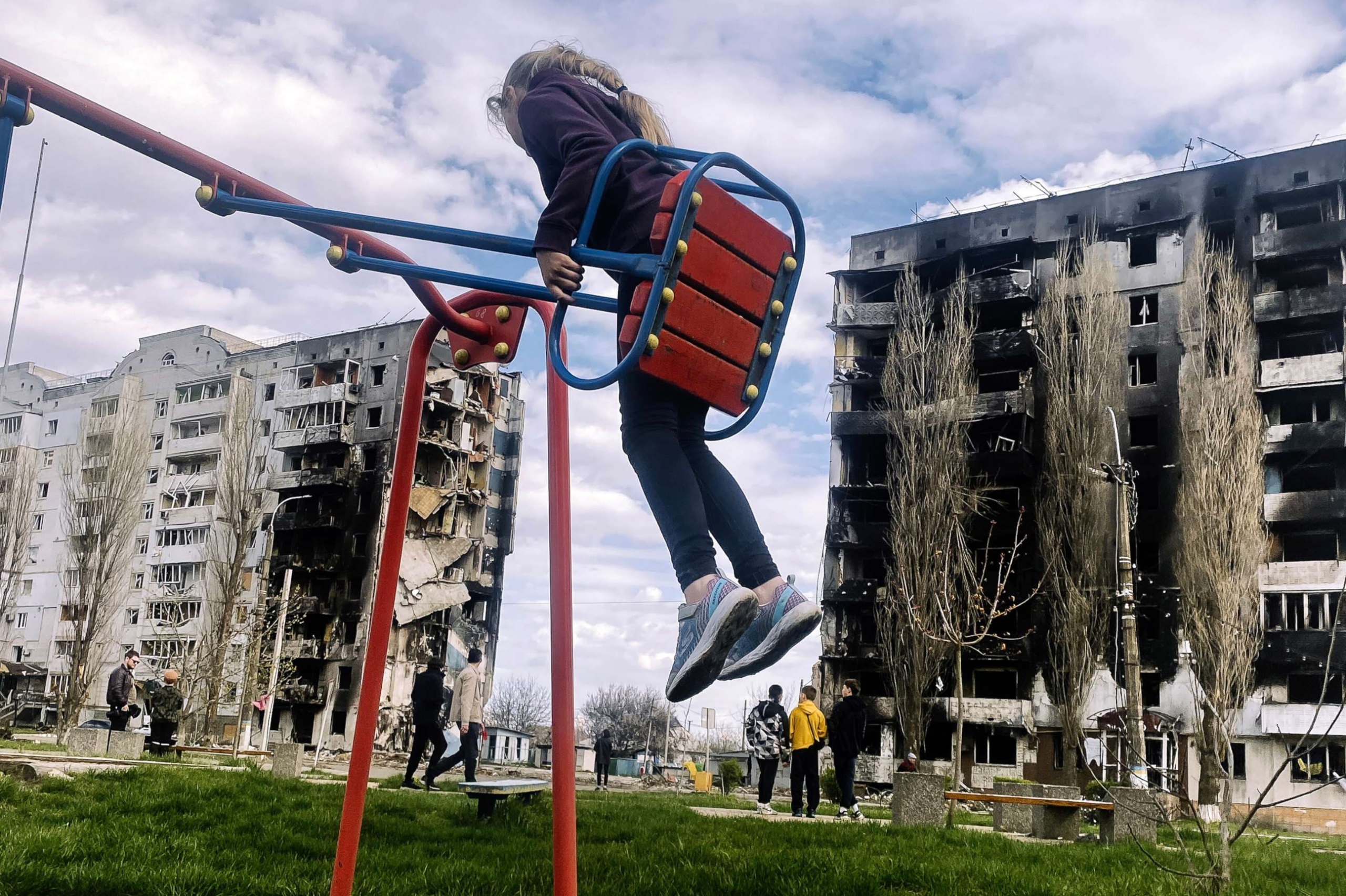 Дівчинка на дитячому майданчику на тлі зруйнованого РФ будинку в Бородянці. Фото: Kuba Kaminski / ABC NewsБородянка – одне з найбільше постраждалих місць на Київщині в матеріальному плані. Російські військові били тут по будинках авіацією й танками, тож лише під завалами знайшли 41 тіло, а ще частину місцевих розстріляли.
