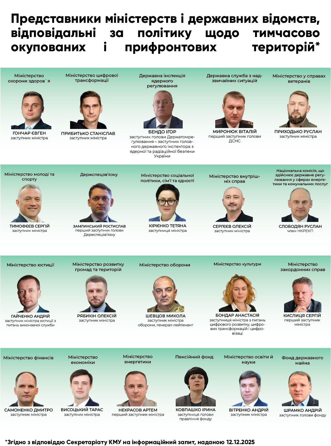 Редакція ZMINA звернулась із запитом до Секретаріату Кабінету Міністрів, щоб з’ясувати, кого саме міністерства визначили відповідальними за політику щодо тимчасово окупованих і прифронтових територій. У відповідь на запит у секретаріаті надали перелік таких представників у 21 органі виконавчої влади, серед яких міністерства, Державна служба з надзвичайних ситуацій, Пенсійний фонд, Фонд держмайна та інші.