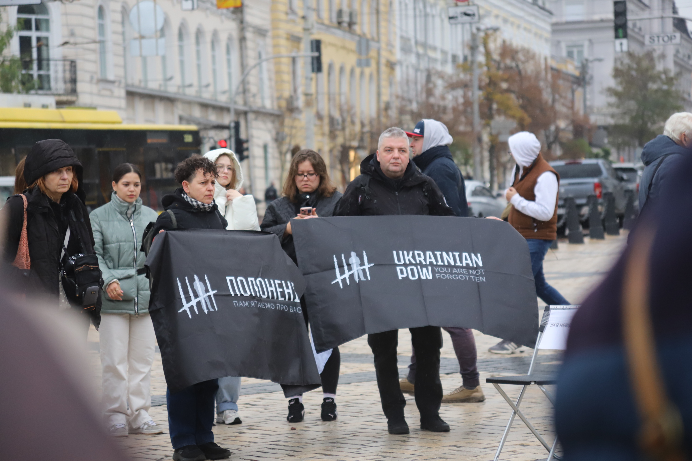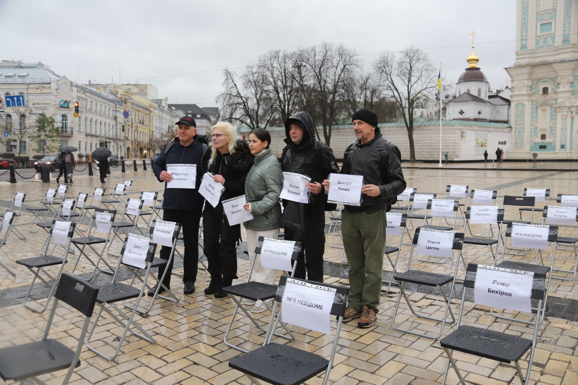 Фото: Олександра ЄфименкоУ суботу, 15 листопада, на Софійській площі в Києві пройшла акція “Порожні стільці” – інсталяція з порожніми сидіннями з іменами журналістів, письменників та правозахисників, які перебувають у російському полоні чи були зниклі безвісти. Учасники закликали міжнародну спільноту посилити тиск на РФ, аби домогтися звільнення цивільних заручників.