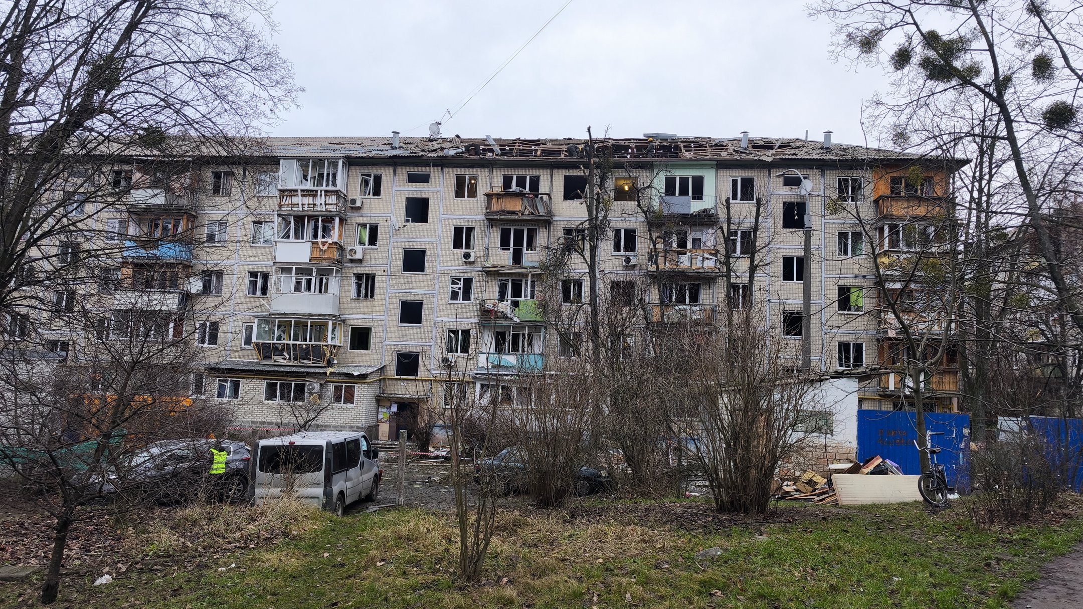 Пошкоджений будинок у Святошинському районі, 23 грудня. Фото: “Суспільне Новини” / Дар’я Нематіан ЗолбінПід час удару російських безпілотників по Києву жінка перебувала у Святошинському районі. Вона отримала осколкові поранення голови та у важкому стані потрапила до лікарні.