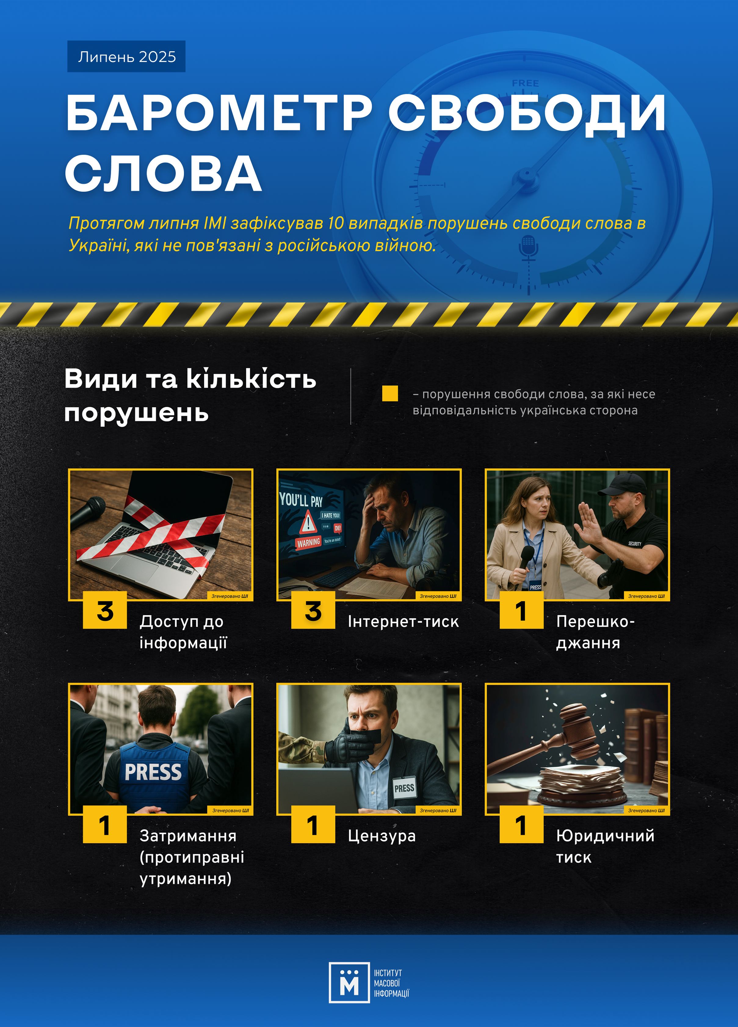 У липні 2025 року Інститут масової інформації зафіксував 10 випадків порушення свободи слова в Україні. Йдеться про перешкоджання, незаконне затримання, цензуру, юридичний тиск, обмеження доступу до інформації та інтернет-атаки.