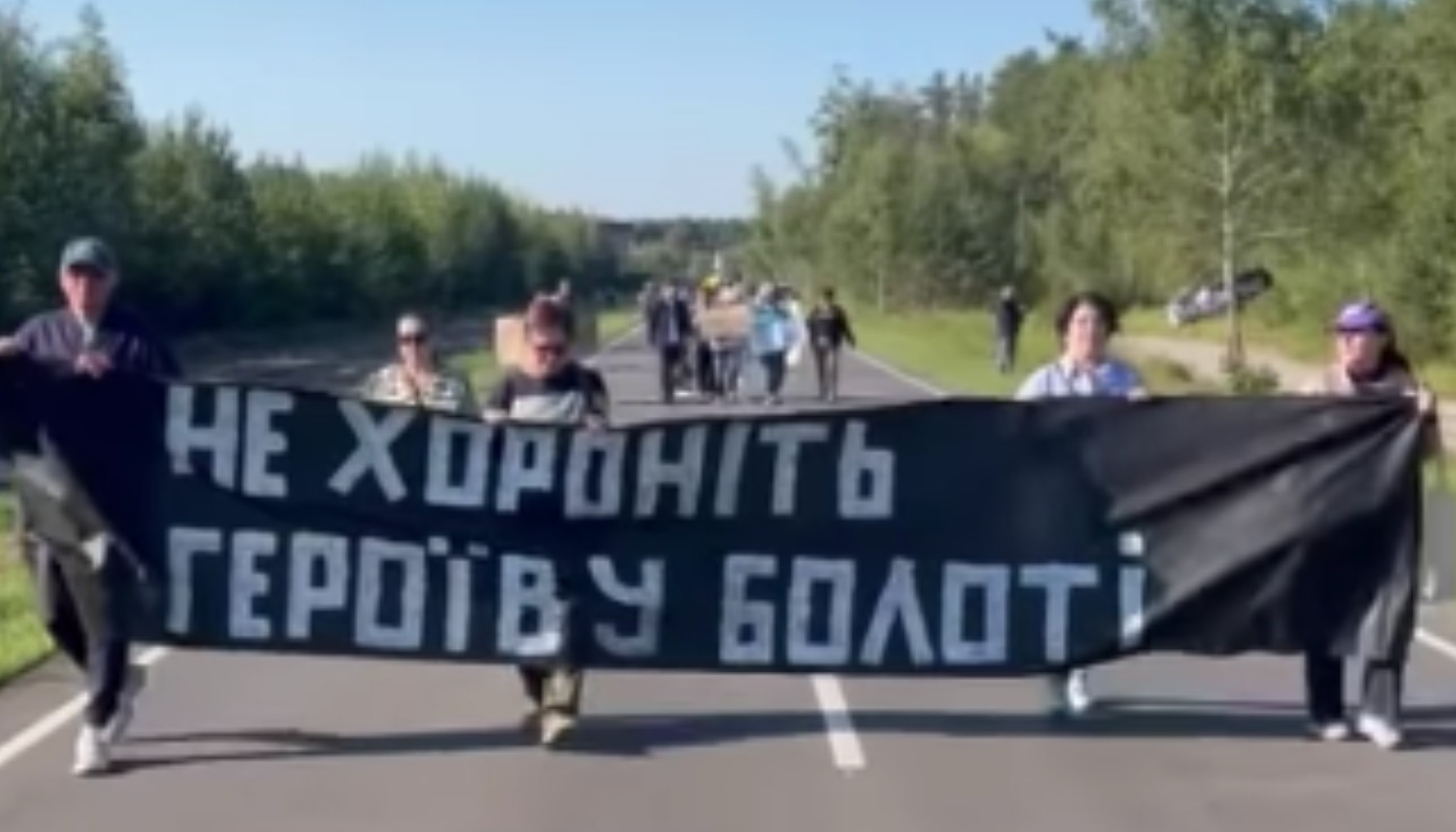 Вони скандували “Україна понад усе”, тримали плакати “Жадібність чиновників вбиває екологію” й “Гроші на зброю”, а також йшли дорогою у колоні, розтягнувши великий банер з написом: “Не хороніть Героїв у болоті!”.