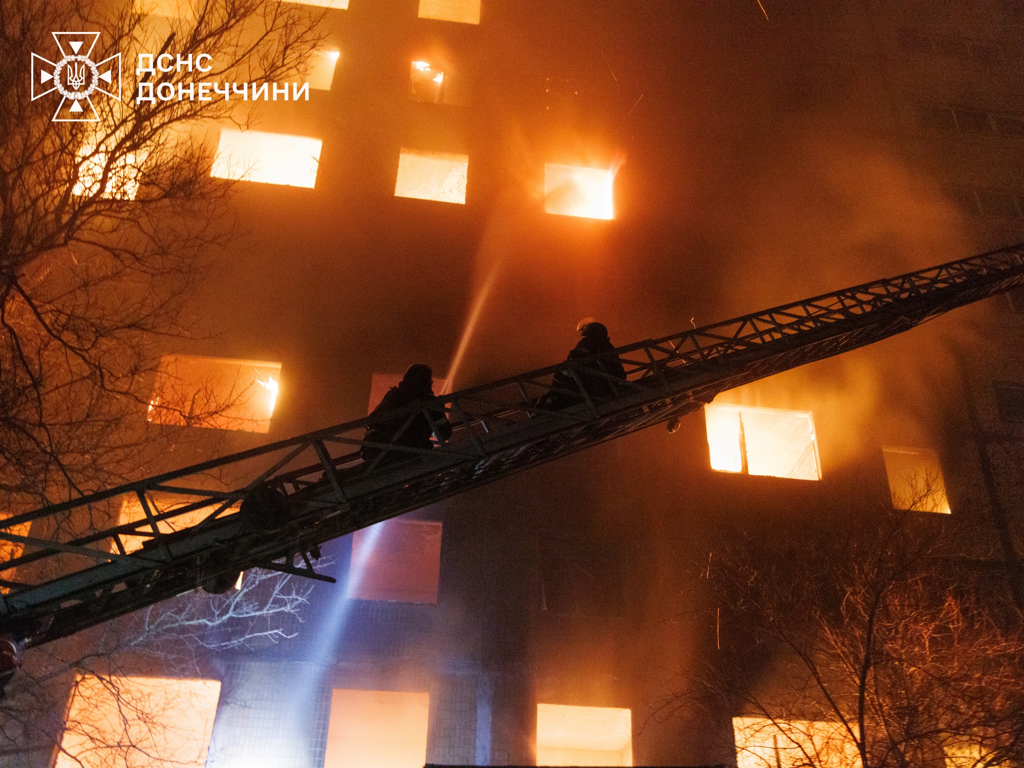 Рятувальники разом з цивільними йдуть темною дорогою, поки на тлі горить багатоповерхівка, по якій влучили російські військові 1 грудня 2025 року. Фото: ДСНС ДонеччиниНагадаємо, що за неповний рік росіяни запустили по Україні понад 44 тисячі лише керованих авіабомб, які є однією і з причин переважної більшості смертей цивільних.