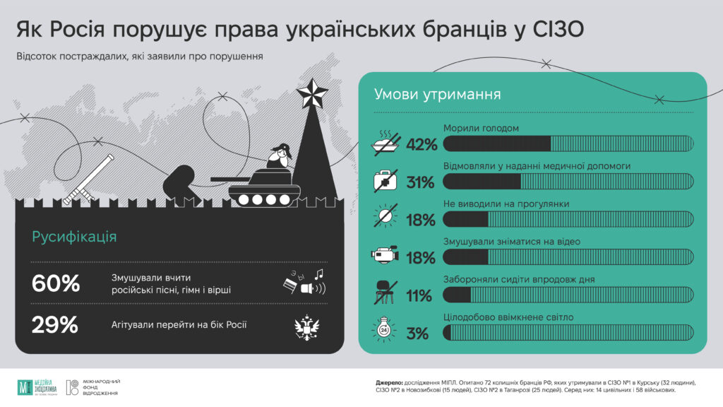 За даними МІПЛ, окрім здійснення психологічного тиску, росіяни тримають українців в нелюдських умовах, не виводять на прогулянки, забороняють вдень сідати на ліжка та морять голодом.
