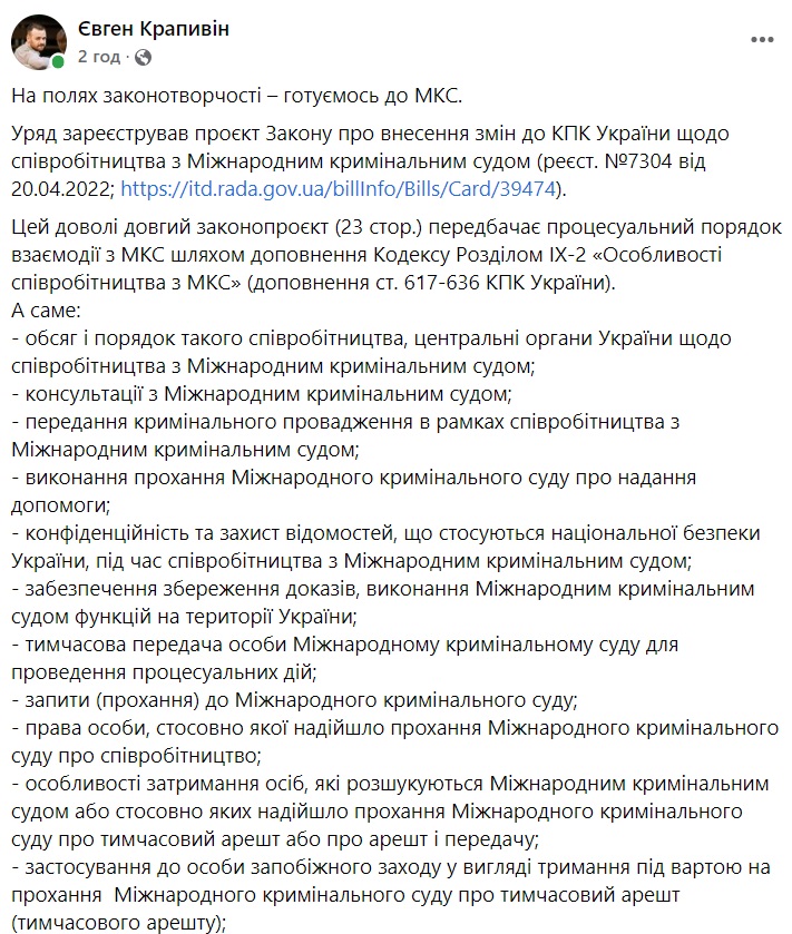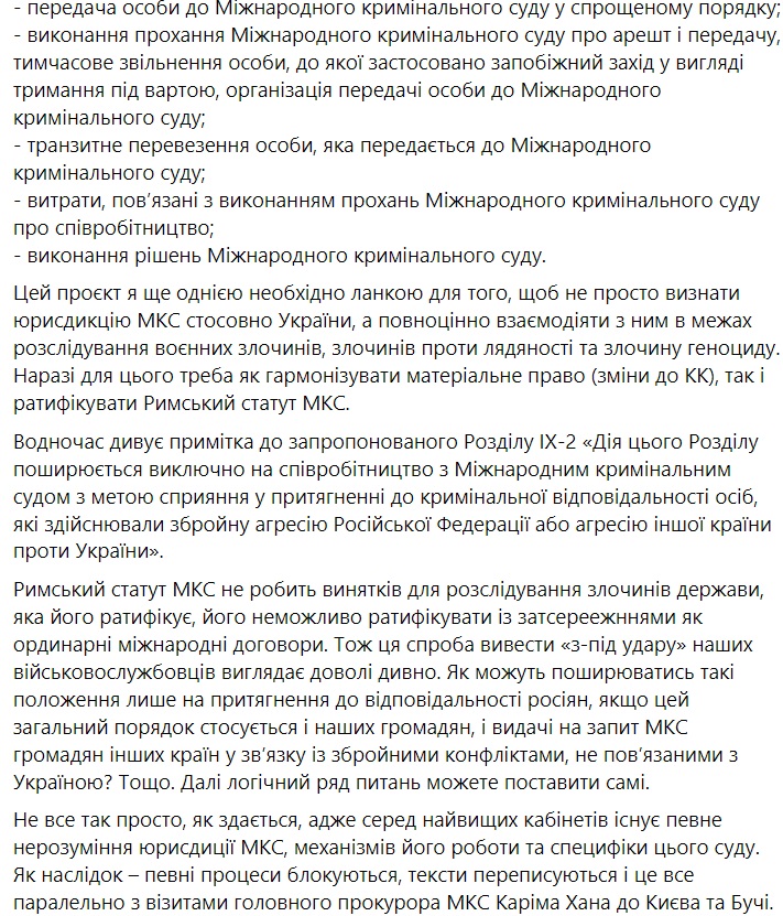 “Цей доволі довгий законопроєкт – 23 сторінки – передбачає процесуальний порядок взаємодії з МКС шляхом доповнення кодексу Розділом ІХ-2 “Особливості співробітництва з МКС” (доповнення ст. 617-636 КПК України)”, – написав він на своїй сторінці у фейсбуку.