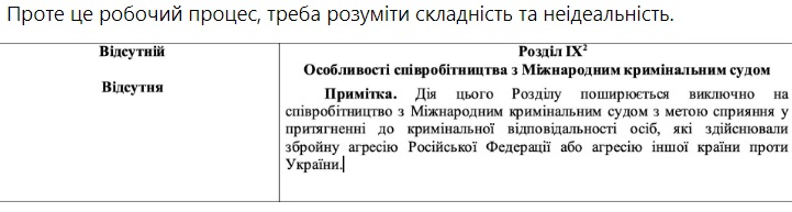 Водночас юрист піддав сумніву доречність примітки до запропонованого розділу ІХ-2: “Дія цього розділу поширюється виключно на співробітництво з Міжнародним кримінальним судом з метою сприяння в притягненні до кримінальної відповідальності осіб, які здійснювали збройну агресію Російської Федерації або агресію іншої країни проти України”.