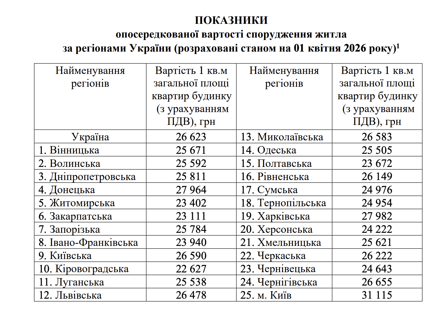 Міністерство розвитку громад та територій України затвердило нові показники опосередкованої вартості спорудження житла за регіонами, які безпосередньо впливають на розрахунок максимальної ціни житла, що може фінансуватися за програмою.