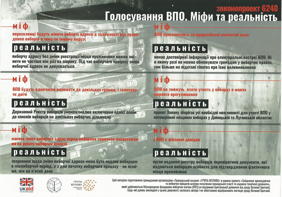 Нагадаємо, 27 березня виповнюється два роки з моменту реєстрації у Верховній Раді законопроекту №6240, який пропонує усунути юридичні та практичні бар’єри на виборах для внутрішньо переміщених людей та мобільних громадян. Українські та міжнародні правозахисні організації закликають народних депутатів ухвалити цей документ.