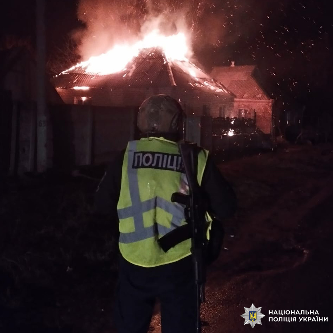 Поліціянт дивиться на будинок, охоплений полум’ям після удару російських військових по Харківщині
