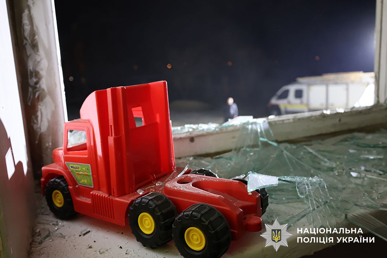 Дитячий вантажний автомобіль на тлі машини рятувальників, яку видно з розбитого вікна другого поверху будівлі у Запоріжжі, по якій вгатили російські військові