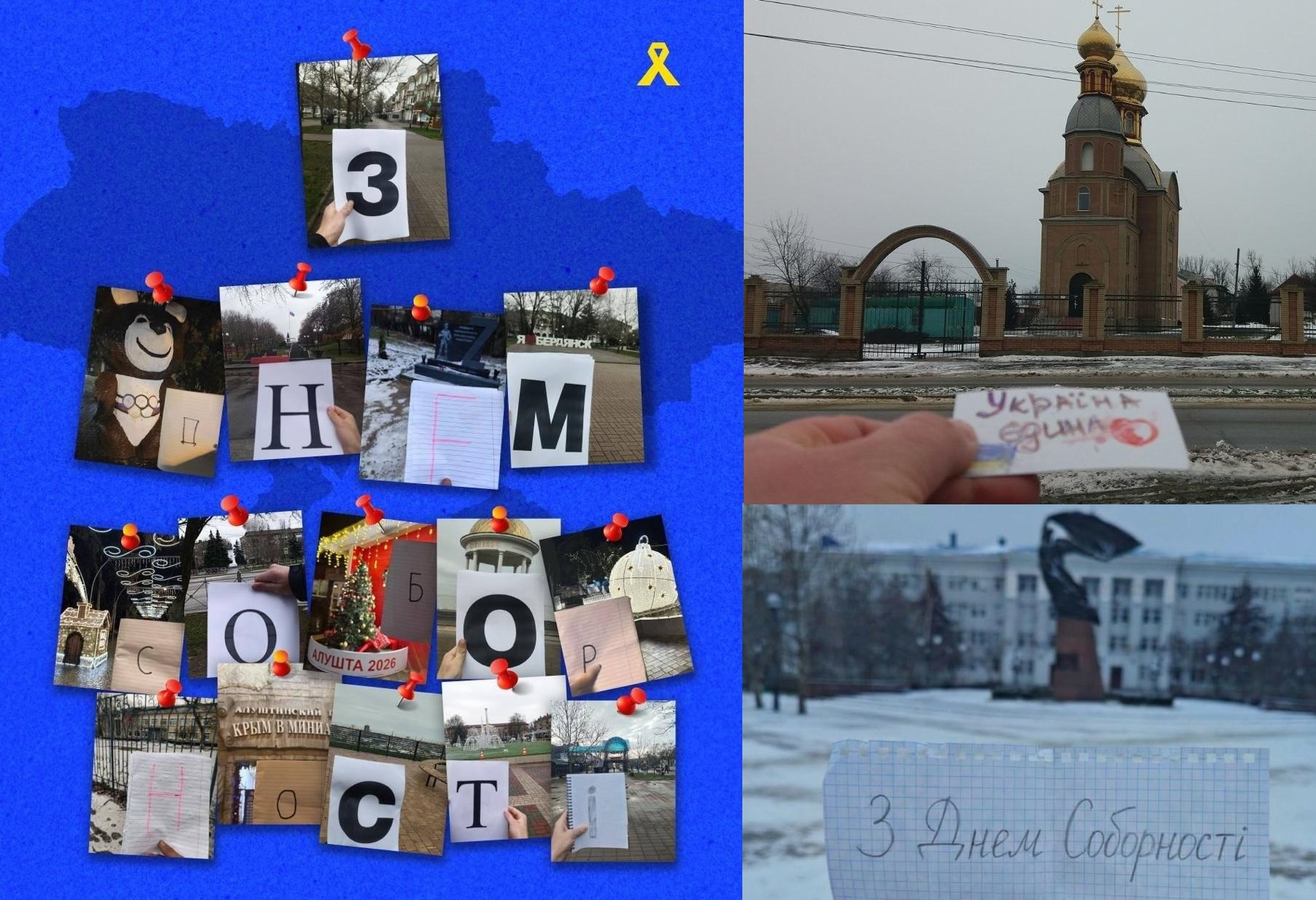 У різних містах вони фотографували вітальні листівки, а також окремі літери алфавіту, щоб потім скласти з них фразу “З Днем соборності” — своєрідне символічне послання українців з окупації людям на підконтрольну територію.