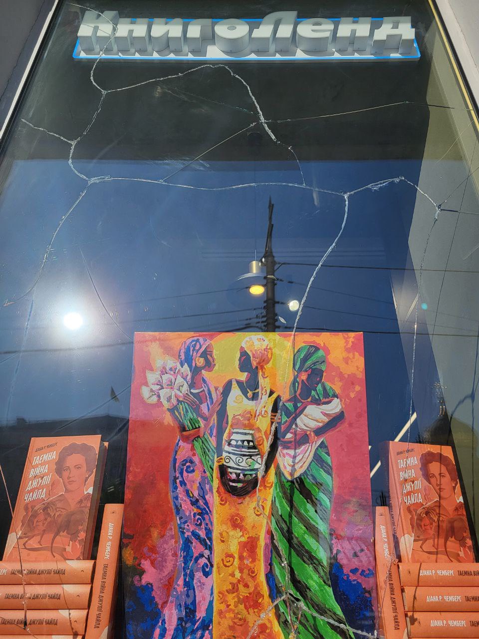 “КнигоЛенд” також постраждав від ударної хвилі: там розбиті вікна, пошкоджене приміщення та зіпсовані книжки.