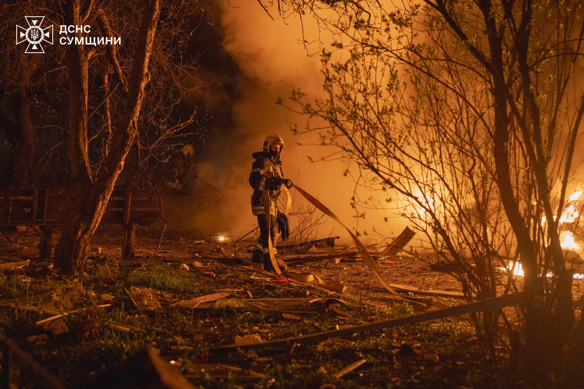 Місце російського удару на СумщиніУночі російські військові били по Україні 135 дронами та двома ракетами, з яких українським бійцям вдалося збити 117 цілей. Водночас у 22 місцях зафіксували влучання 17 дронів.