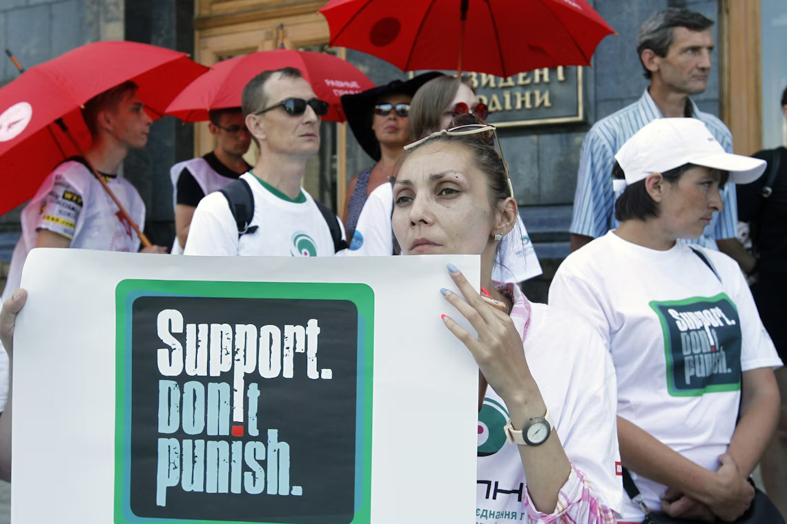 Учасниця протесту під Офісом президента у Києві у 2019 році тримає плакат з написом: “Підтримай, а не карай”. Мітингарі зібрались тоді, щоб закликати змінити наркополітику уряду. Фото: Pavlo Gonchar/SOPA/NewscomЕксперти не раз до цього закликали змінити наркополітику, щоб не карати тих, хто вживає речовини, бо залежність від них – це хвороба.