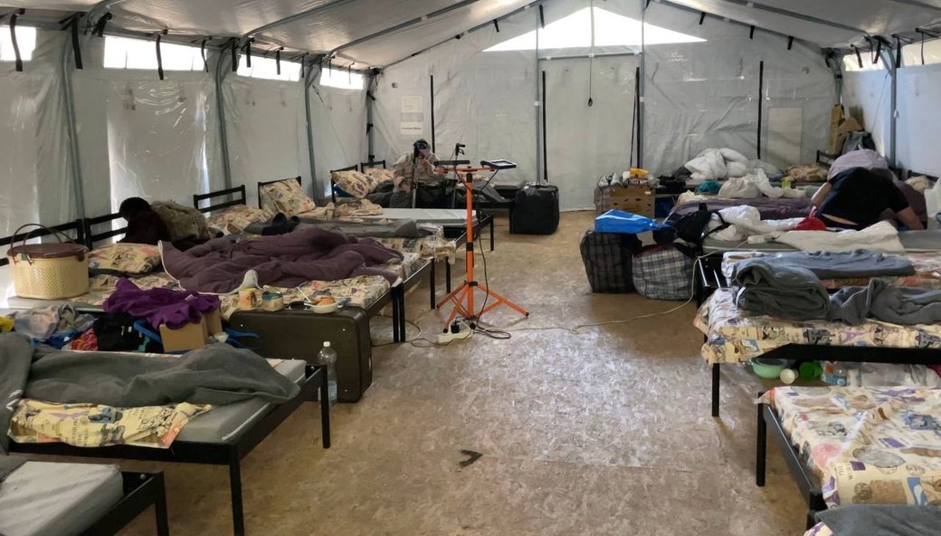 Переселенка стоїть на тлі намету для евакуйованих у центрі в Павлограді. Фото: Суспільне ДніпроПриймати евакуйованих планують у 15 областях та Києві, де для цього підготують щонайменше 30 тисяч місць. Посадовці кажуть, що місця передбачені для поселення на довгий термін.