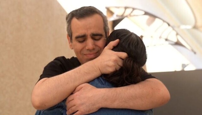 Звільнений Омрі Міран возз’єднується з партнеркою Лішай Міран-Лаві після більш ніж двох років полону ХАМАС. Фото: Армія оборони ІзраїлюБойовики утримували заручників 738 днів.