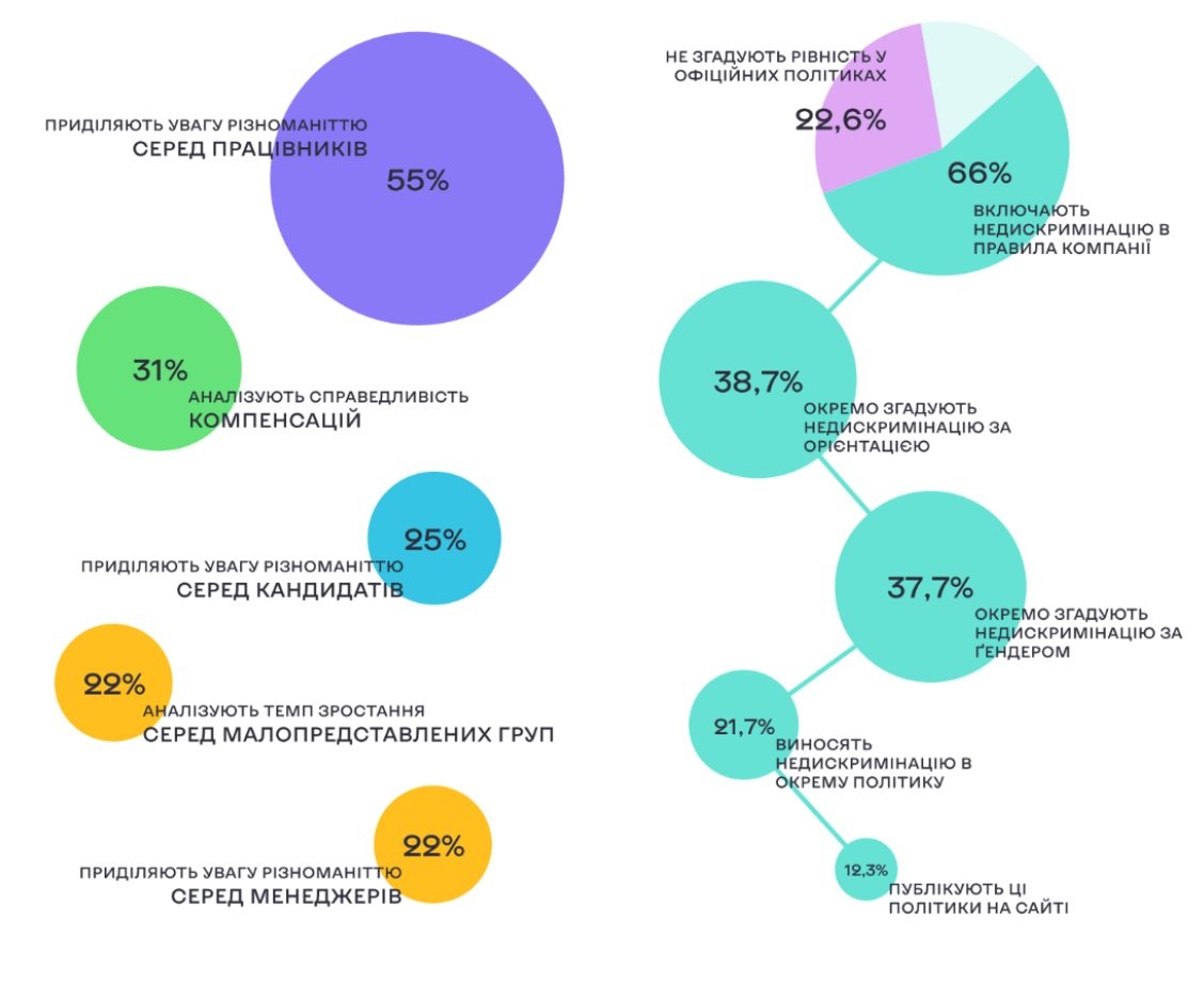 Щодо впровадження політик, 22% компаній аналізують різноманітність серед менеджерів і кар’єрне зростання малопредставлених груп, 25% враховують різноманітність кандидатів, 31% перевіряють справедливість зарплат, а 55% стежать за різноманітністю серед працівників. Проте опитування не уточнює, чи стосуються ці заходи ЛГБТІК-людей.