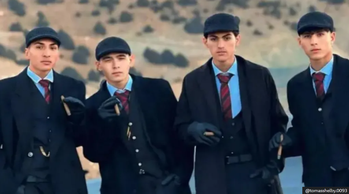 На відео, опублікованому в інтернеті, молоді чоловіки позують у кепках і костюмах-трійках, схожих на ті, що носили герої телесеріалу “Гострі картузи”, події якого відбуваються в Англії невдовзі після Першої світової війни.
