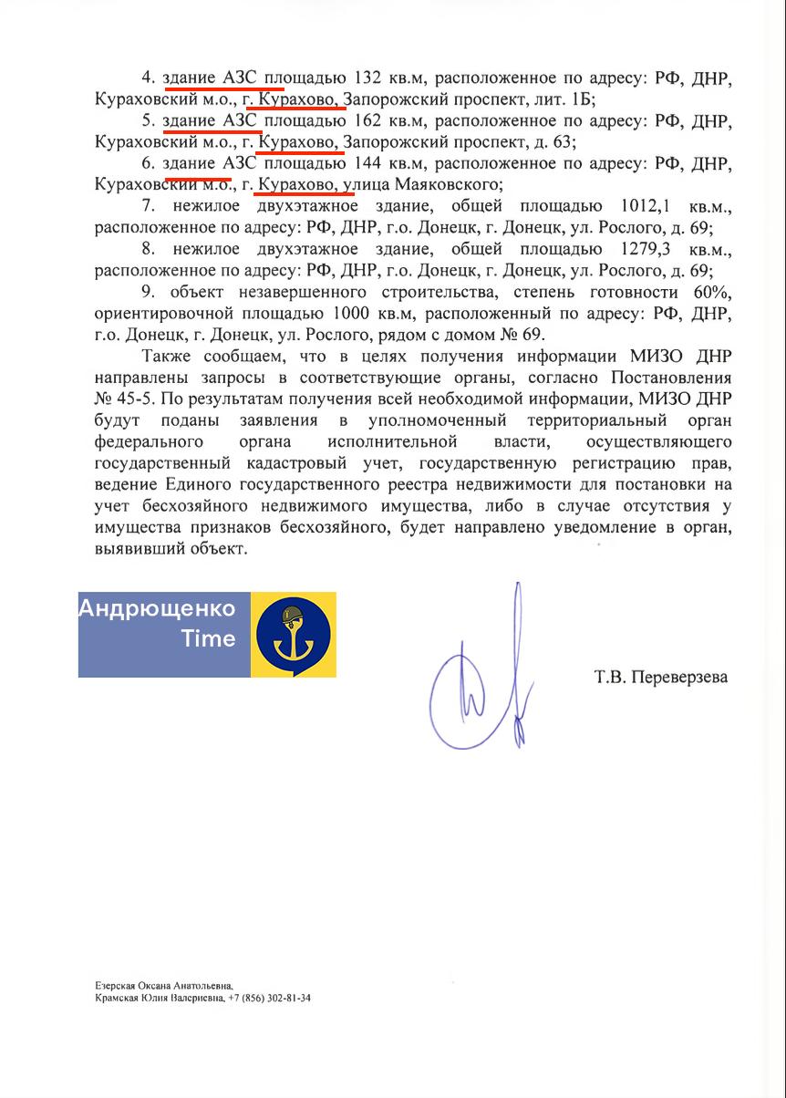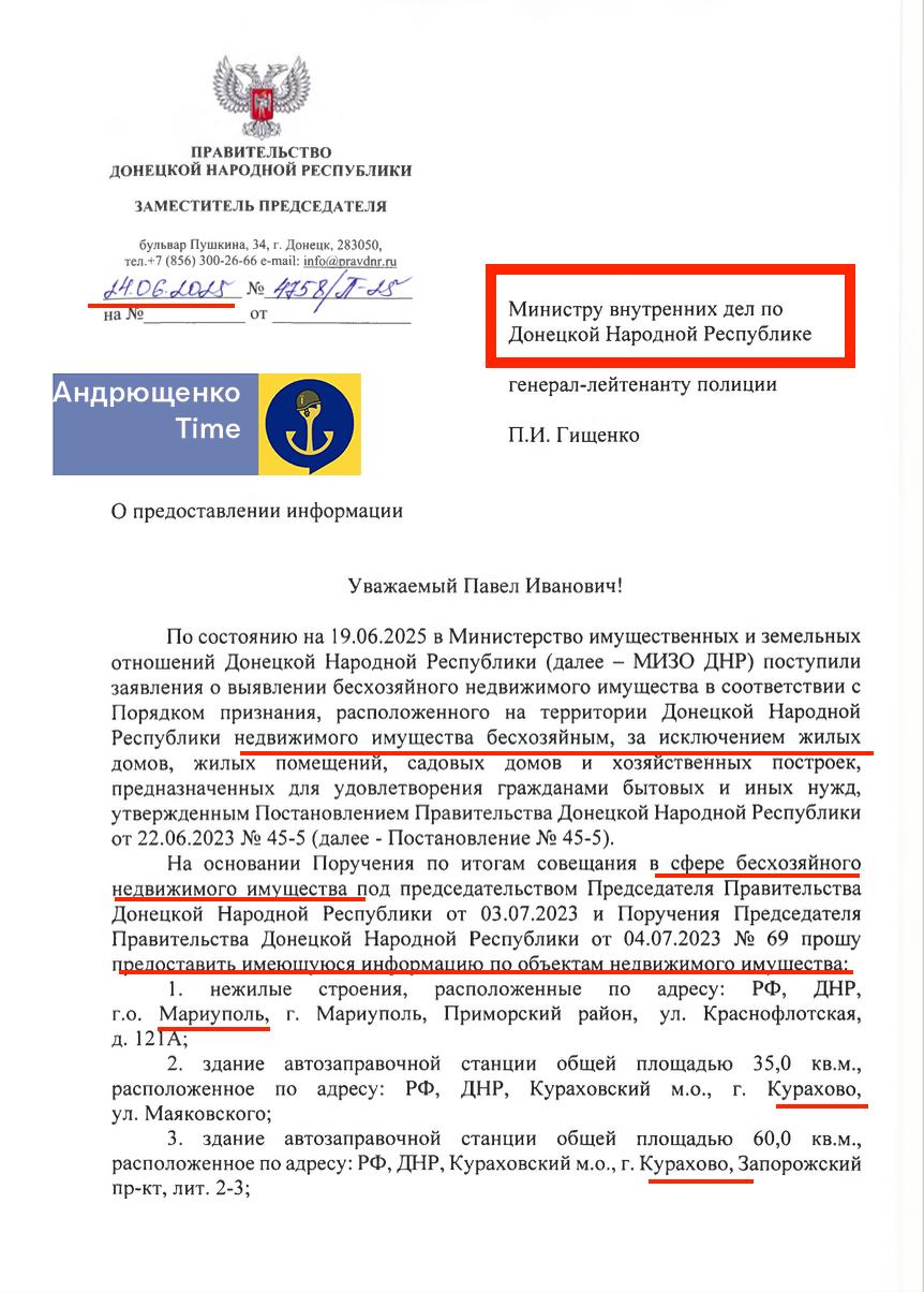 Також у документі йдеться про привласнення “безгоспного нерухомого майна” у Маріуполі.