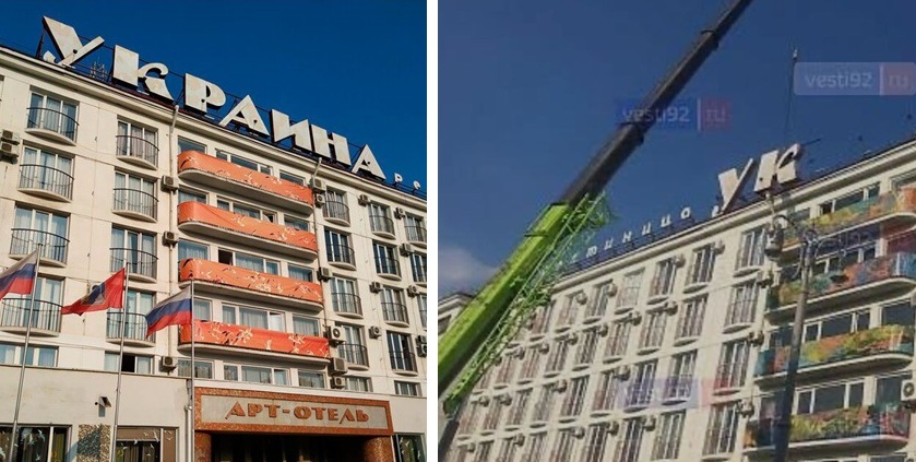 Готель “Україна” в Севастополі до демонтажу вивіски окупантами та після. Фото з відкритих джерелПравозахисники наголосили, що цей крок — черговий приклад того, як росіяни намагаються стерти будь-які згадки про Україну з публічного простору окупованого Криму. Для цього вони перейменовують вулиці, зносять пам’ятники, змінюють історичні назви і навіть вивіски, які десятиліттями були частиною міста.