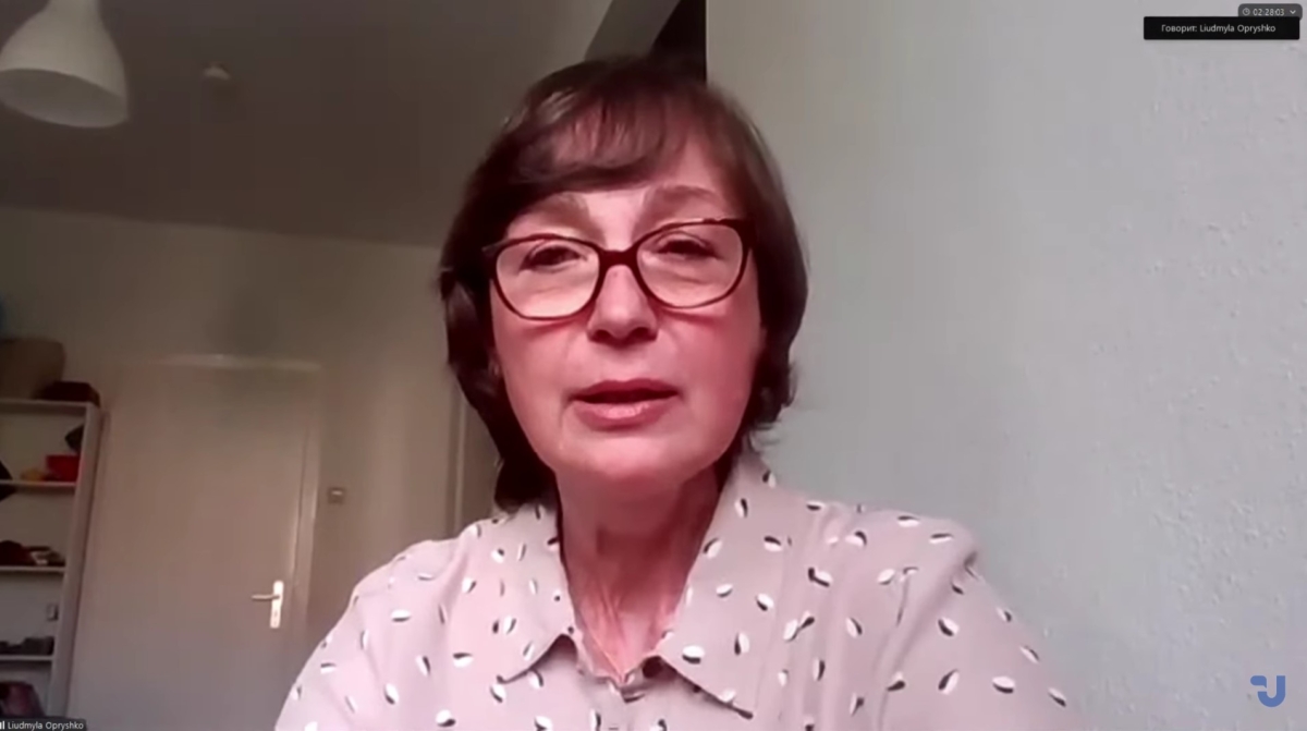 Медіаюристка Людмила Опришко (скриншот із трансляції)Обговорення організували Комітет ВР з питань свободи слова, Національна рада України з питань телебачення і радіомовлення та громадська організація “Платформа прав людини”.