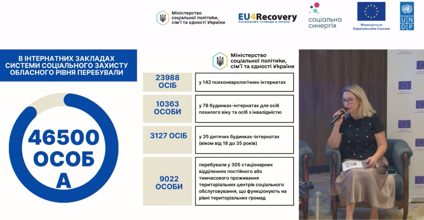 скриншот презентації МінсоцполітикиОлена Фартушна озвучила статистику, скільки людей в Україні наразі перебувають в інтернатних закладах. Зокрема, понад 20 тисяч людей перебувають у 142 психоневрологічних інтернатах. За її словами, у 35 дитячих будинках-інтернатах 80% – це люди віком 18-35 років. У 305 стаціонарних відділеннях перебувають понад 9000 людей старшого віку та з інвалідністю.