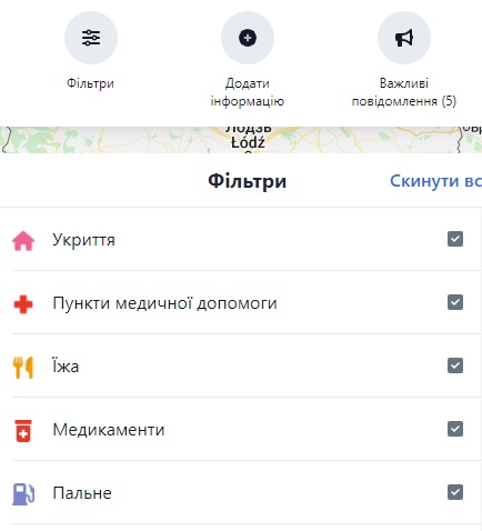 На сайті розташована інтерактивна мапа із актуальною інформацією про місця першої необхідності, які працюють: