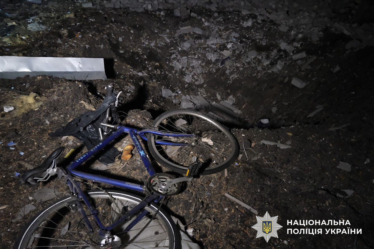 Велосипед лежить поблизу вирви, яка лишилася від влучання або російського снаряда або його уламків у Донецькій областіЩе п’ятеро людей учора травмувалися на Херсонщині.