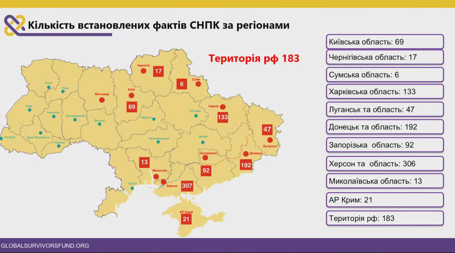 Скриншот презентаціїПілотний проєкт із виплати проміжних репарацій постраждалим від сексуального насильства, пов’язаного із конфліктом (СНПК) стартував у березні 2024 року. Розмір виплати для постраждалих від сексуального насильства внаслідок війни становив 3000 євро. Ці репарації виплачував Global Survivors Fund (GSF), що фінансується урядами різних країн.