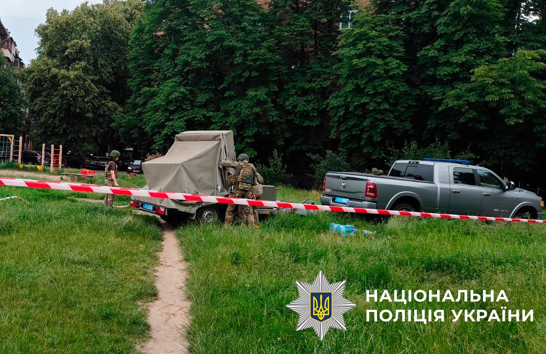 На фото, що публікує поліція, видно, як фахівці збирають касети у звичайному дворі житлової багатоповерхівки поблизу дитячих майданчиків.