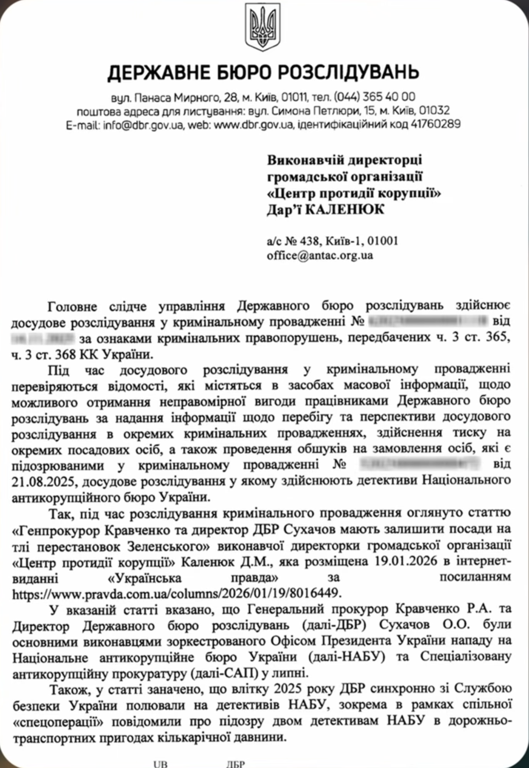 Після публікації колонки на “Українській правді” про звільнення директора ДБР Олексія Сухачова відомство надіслало журналістці та виконавчій директорці Центру протидії корупції Дар’ї Каленюк листа із застереженням не розголошувати матеріал під загрозою кримінальної відповідальності.