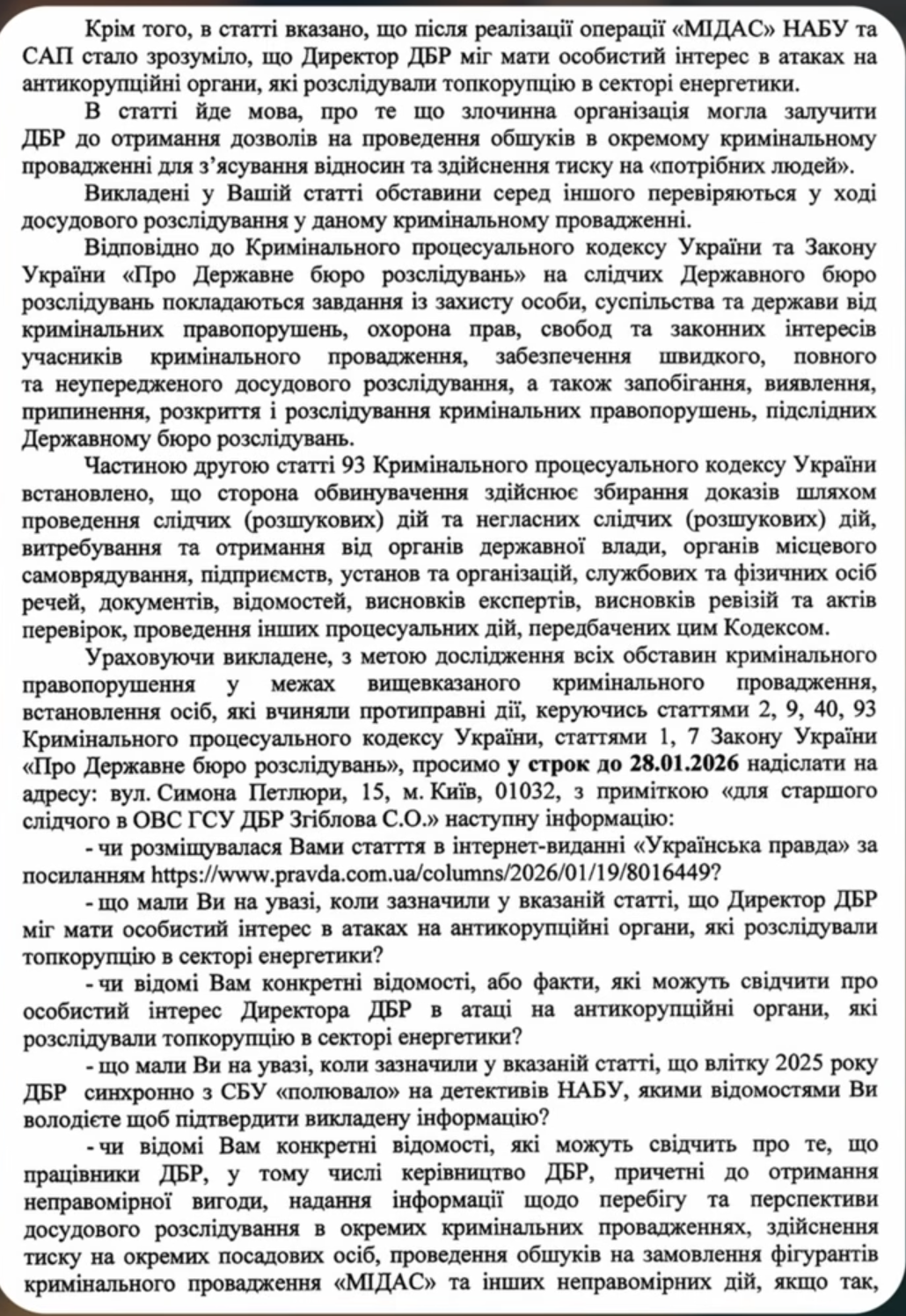 ДБР цікавило, чи публікувала Каленюк колонку на “Українській правді” і що вона мала на увазі, зазначаючи, що директор ДБР міг мати особистий інтерес у діях проти антикорупційних органів, зокрема НАБУ та САП. Журналістка пояснила, що Сухачов має дружину Ірину, яка працювала в “Енергоатомі” у період, коли компанією керував його кум Герман Галущенко. За її словами, зв’язки Сухачова та Галущенка могли впливати на дії ДБР, спрямовані на захист осіб, причетних до корупційних схем в енергетиці, які розслідувало НАБУ, включно з операцією “Мідас”.