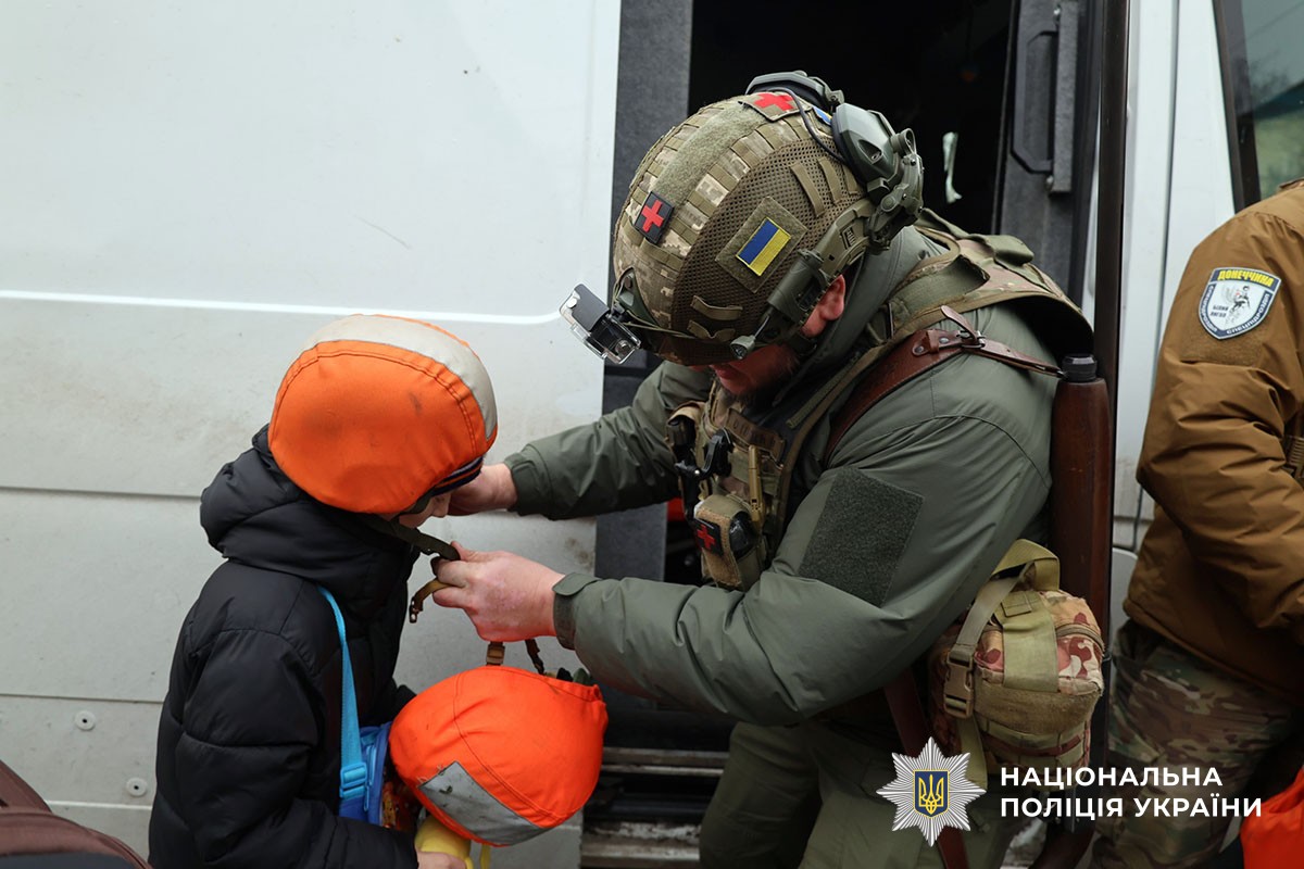 Поліціянт одягає шолом на одного з евакуйованих хлопчиків на ДонеччиніТри родини з дітьми лишались у Миколаївці на Донеччині. Там під постійними обстрілами РФ досі лишаються ще близько чотирьох тисяч людей.