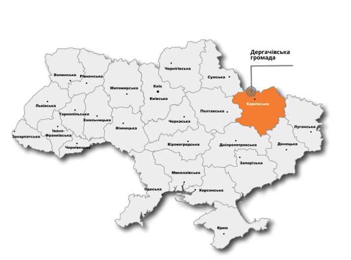Розташування Дергачівської громади на мапі. Скриншот з сайту rebuildukraine.in.ua