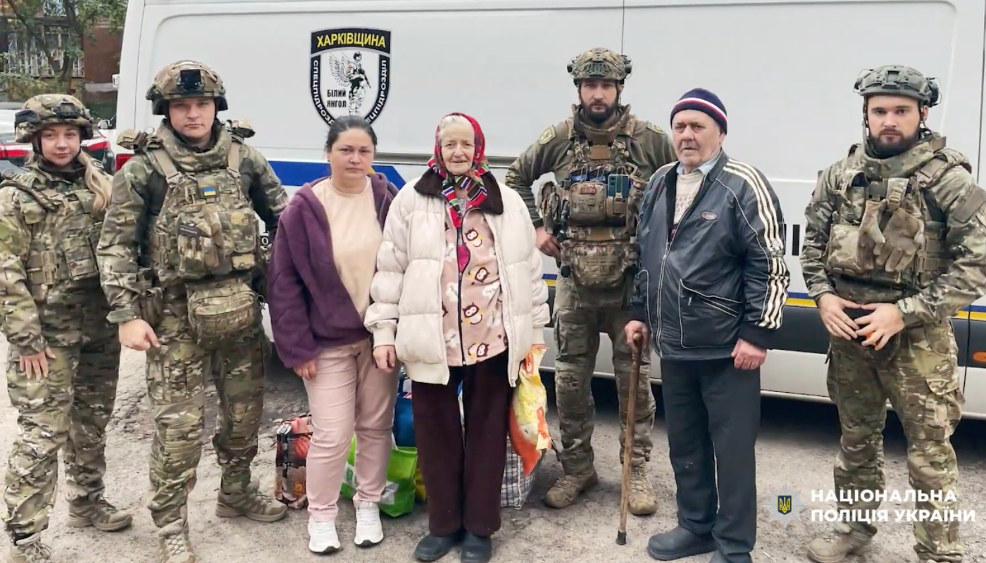 Евакуйовані з Дергачівської громади Харківщини з поліціянтами, які допомагали їм вибратись з небезпеки