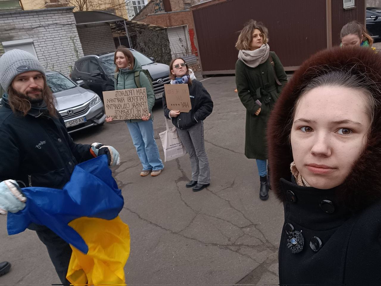 Фото: Людмила ТягнирядноАктивісти “Екопарку Осокорки” прийшли до офісу забудовника “Столиця Груп”, який відкрив продаж квартир у незаконній, на їхню думку, забудові на Осокорках.