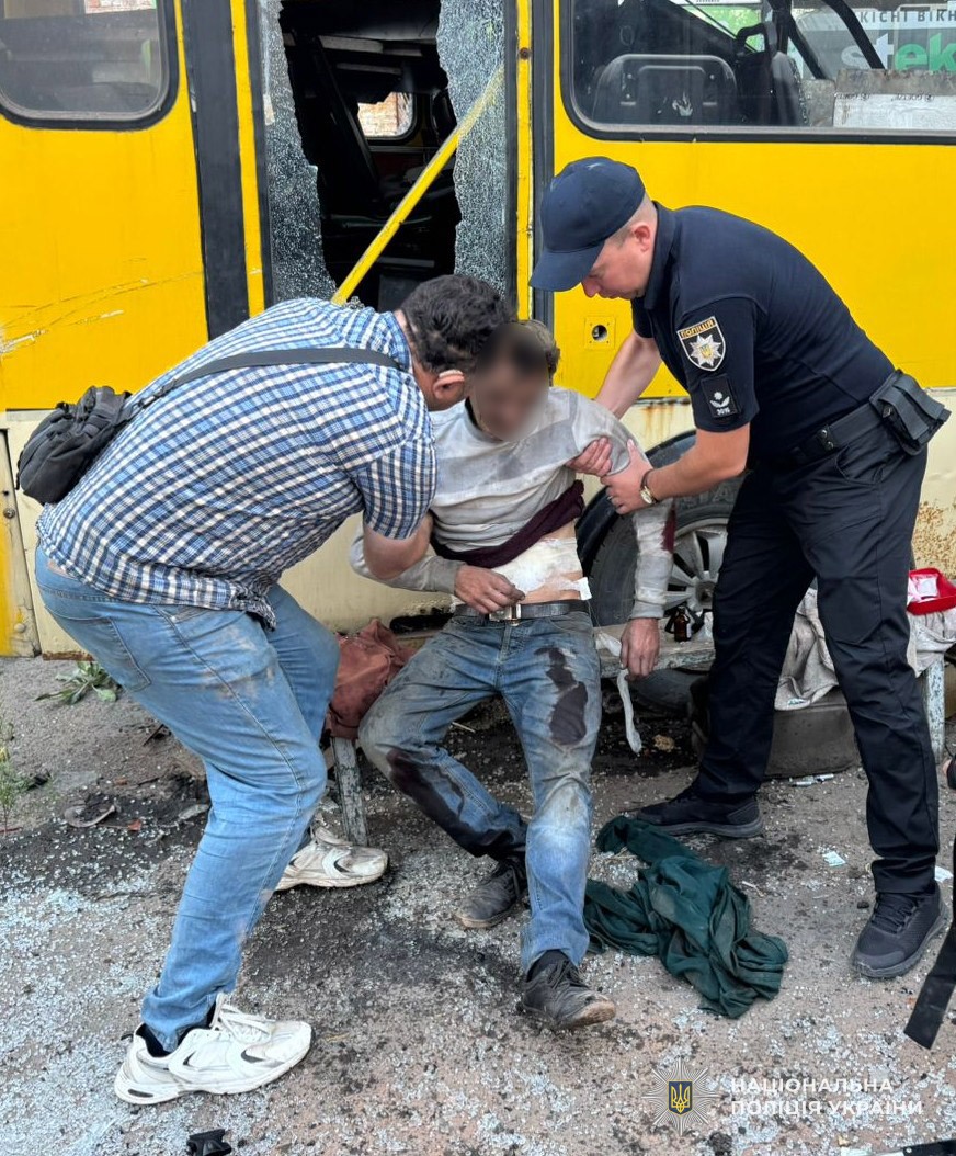 Постраждалий через російський удар по Львову чоловік сидить поблизу автобуса, поки перехожий та поліціянт намагаються йому допомогтиУночі росіяни випустили загалом 614 дронів та ракет, з яких 577 змогли збити українські військові. Цілями обстрілу були Львівщина та Закарпаття, де загалом загинула одна людина, а ще майже два десятки дістали травм, зокрема тяжких.