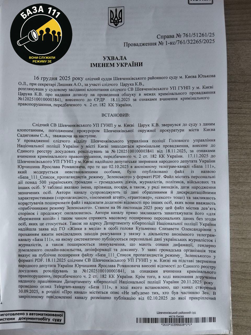 Зазначимо, що народний депутат України Ярослав Юрчишин звернувся до поліції після публікації 2 жовтня 2025 року в телеграм-каналі “База 111” файлу у форматі PDF під назвою “База_111_Список пропагандистів режиму Зеленського”. У документі містяться імена публічних осіб, журналістів і журналісток, громадських діячів і діячок, які автори каналу супроводжують образливими, дискредитаційними характеристиками та закликають поширювати файл і доповнювати його новими даними.