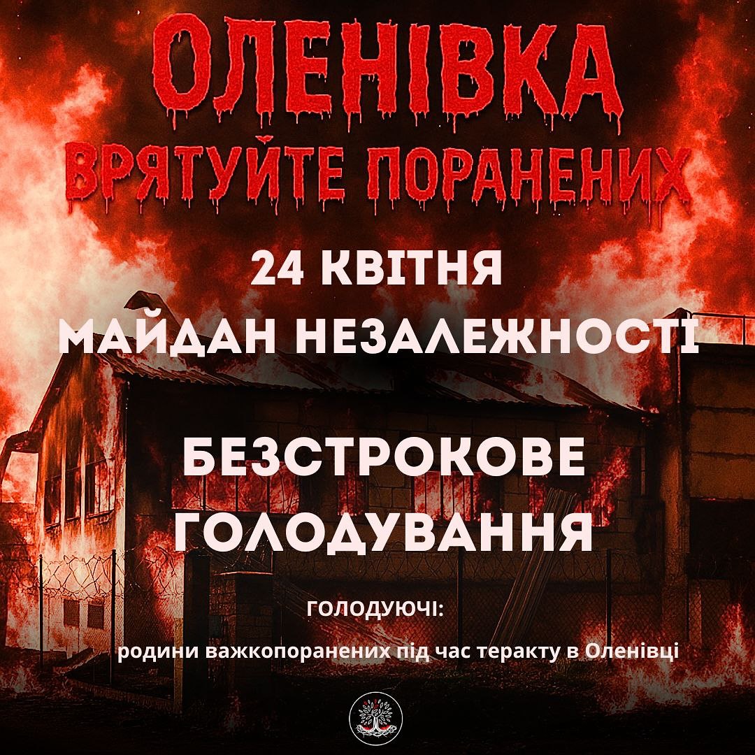 24 квітня о 9:30 на майдані Незалежності члени громадської організації “Спільнота Оленівки” розпочнуть безстрокове голодування. Їхня основна вимога – повернення важко поранених “азовців”, які постраждали від теракту в Оленівській колонії. Окрім цього, родичі наполягають на зустрічі з президентом України Володимиром Зеленським, а також просять депутатів ВР ухвалити законопроєкт №10188 про вшанування загиблих у Волноваській колонії.