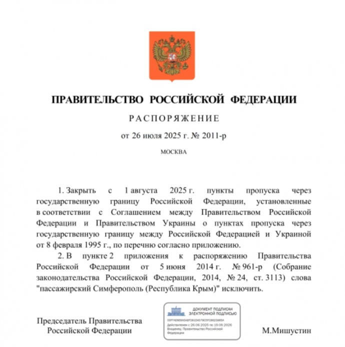 В распоряжении российского правительства говорится о закрытии пунктов пропуска, установленных по соглашению между правительствами России и Украины от 8 февраля 1995 года. В список вошли 13 автомобильных и семь железнодорожных переходов.