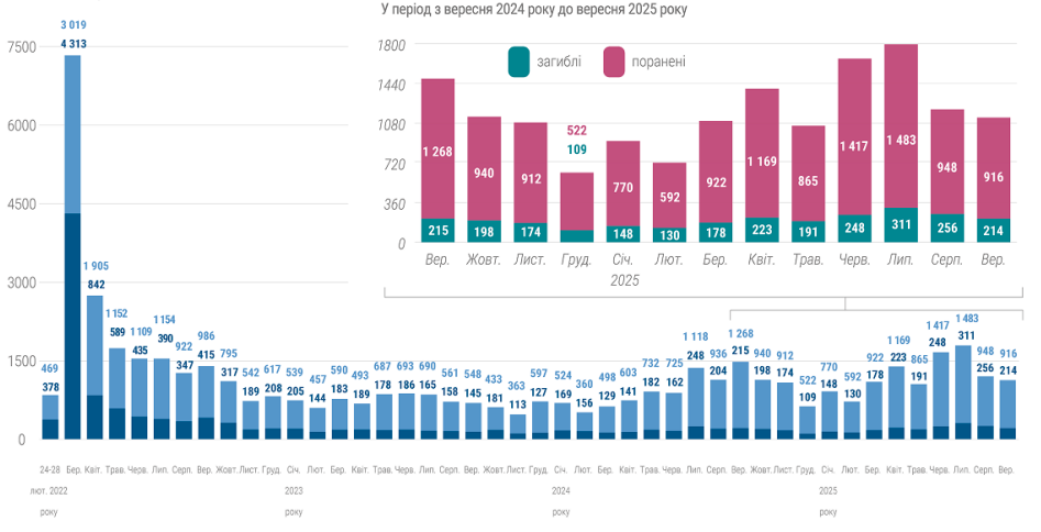Всего в Украине в результате полномасштабного российского вторжения, по состоянию на сентябрь, погибли более 14,3 тысячи гражданских.