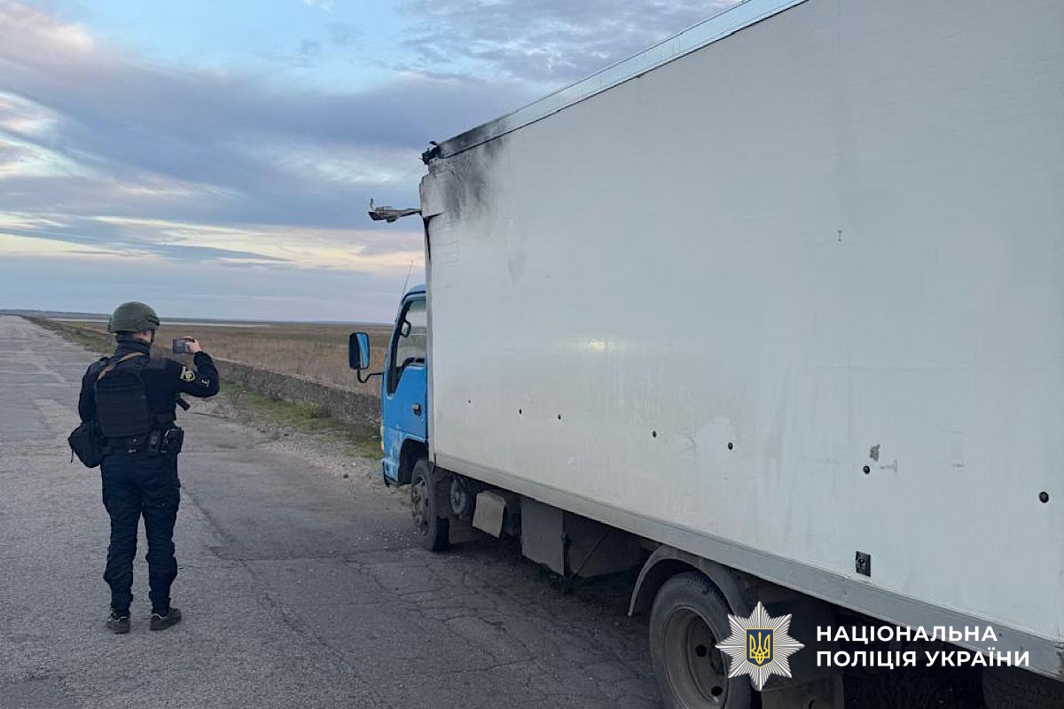Полицейский фотографирует на дороге в Днепропетровской области грузовик, по которому российские военные ударили дрономВ Харьковской области накануне российские военные обстрелом травмировали шесть человек в Харьковском районе. У четырех мужчин диагностировали взрывные травмы и ушибы, а еще у двух женщин острую реакцию на стресс.