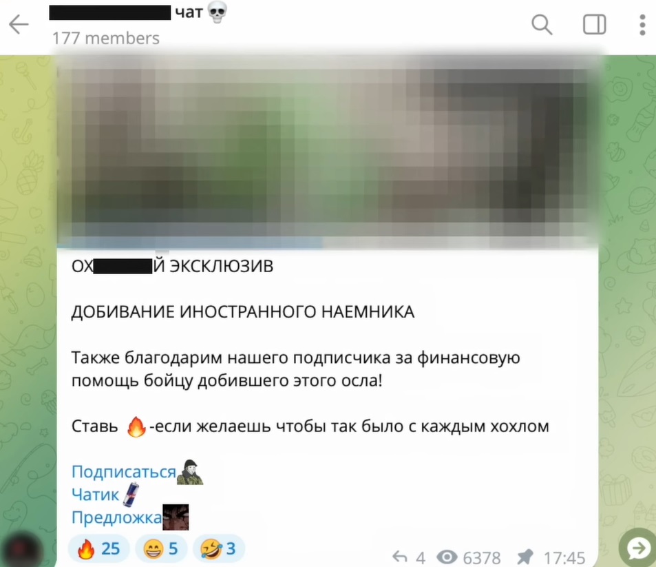 Авторы расследования изучили полсотни каналов, где публикуют жестокие видео, а администрируют их преимущественно гражданские, а не военные. Только в одном нашли 51 видео с массовыми расстрелами и отрезанием голов, а в разделе “Наказания (фото)” еще 53 фотографии трупов, у некоторых из которых связаны руки. Создатели канала собирают и материалы, касающиеся событий до 2022 года.